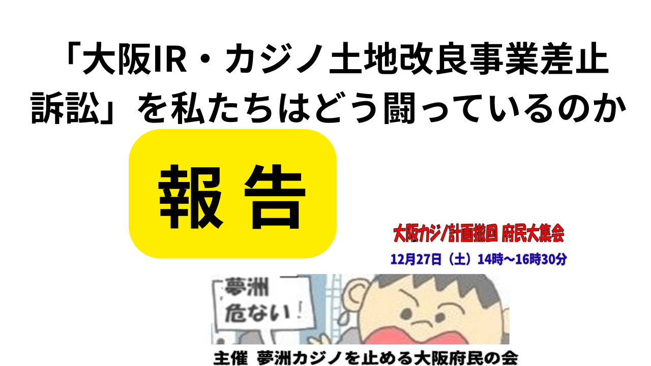 大阪IR・カジノ土地改良事業差し止め訴訟報告(「大阪府民大集会」2025年12月27日) X Facebook はてブ Pocket LINE コピー 2026.01.11 2025年12月27日に開催された「大阪カジノ計画撤回 府民大集会」で訴訟に関する以下の報告がされた。 大阪IR・カジノ土地改良事業差止訴訟を私たちはどう闘っているのか20251227ダウンロード