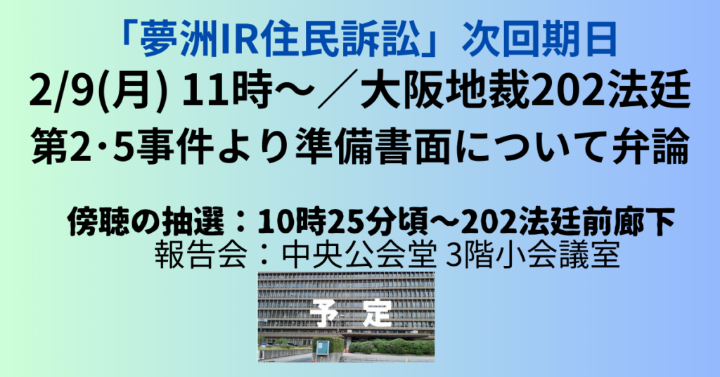 2月9日(月)11時~ 大阪地方裁判所 202大法廷(傍聴券配布は10時25分頃から。202大法廷、横の廊下)